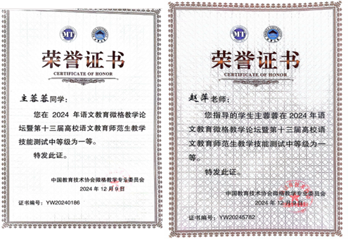 在各类学生竞赛中,赵萍老师所指导的学生屡获佳绩。2019年,获得第九届“华文杯”全国师范生教学能力测试优秀指导教师奖,所指导学生分别获得二等奖、三等奖;2020年,获得“第二届河北省高等学校师范生教学技能竞赛”优秀指导教师奖,所指导学生分别获得特等奖、优秀奖。2024年,带领学生参加全国师范生教学能力测试,学生获得一等奖、二等奖、优秀奖,如图。