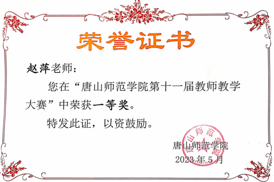 在教学工作中,赵萍老师担任语文课程标准解读、语文教材研究与教学设计、班级管理等多门课程的讲授,主讲课程“班级管理”获得“唐山师范学院课程思政示范课程”,参加唐山师范学院第十一届教师教学大赛获得一等奖,如图。