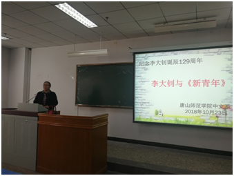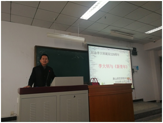 为纪念中国共产主义先驱、杰出的无产阶级革命家、中国共产党的主要创始人之一李大钊同志诞辰129周年,中文系于10月23日下午举办了“李大钊与《新青年》”专题讲座。主讲人为现当代文学教研室教师、文学博士郑丽丽副教授,参加讲座的有中文系党总支书记张学鹏,现当代文学教研室教师陈自然、刘学云、汪贻菡以及2016级、2017级优秀同学代表30余人。