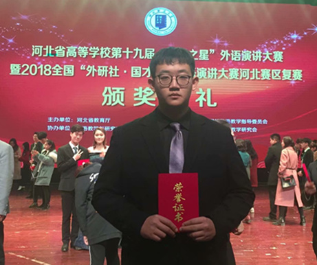 2018年11月17日-18日,由河北省教育厅、省高校外语专业教学指导委员会、省高校外语学会主办,河北师范大学承办的河北省高等学校第十九届“世纪之星”外语演讲大赛在省会石家庄隆重举行,来自我省103所高校的411名优秀选手参加了为期两天的激烈角逐。大赛分英语专业学生组、非英语专业学生组、英语教师组、高职高专组、日语专业学生组、日语专业教师组六个组别进行。我系鲍文楷同学荣获一等奖,为beat365官网赢得了荣誉。