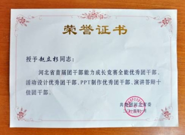 近日,由共青团河北省委组织的河北省首届团干部能力成长竞赛决赛结束,在100余名参赛选手中,我系团总支书记赵立杉老师荣获“全能优秀团干部、活动设计优秀团干部、PPT制作优秀团干部、演讲答辩十佳团干部”等四项称号,为beat365官网争得了荣誉。河北省首届团干部能力成长竞赛是河北省团省委为进一步加强全省共青团干部能力素质建设,切实提升各级团干部在新形势下做好共青团工作的能力和本领,面向全省各级团组织举办的竞赛。