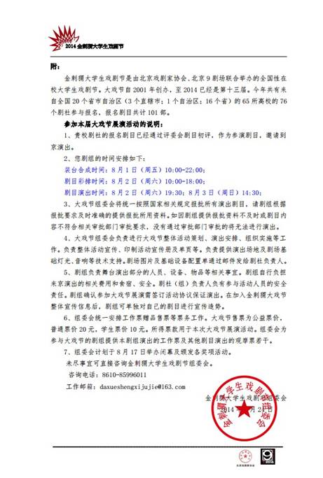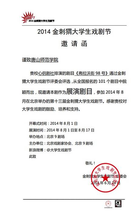 | | 2014年6月21日,2014金刺猬大学生戏剧节剧目初评会在北京9剧场举行。来自北京戏剧家协会、中央戏剧学院、北京人艺、中国艺术研究院等单位的12名评委老师,对本次大戏节报名的101部剧目进行了集中审评。唐山师范学院中文系心侣剧社的原创话剧《弗拉沃街98号》和中国传媒大学、复旦大学、上海戏剧学院、上海交通大学等名校的17部剧作脱颖而出,成功入选大戏节展演剧目。这是唐山师范学院中文系心侣剧社的戏剧继2005年、2009年两次入选全国大学生戏剧节之后第三次入选。beat365官网作品的演出时间初步定于2014年8月2日晚19:30,8月3日下午14:30。