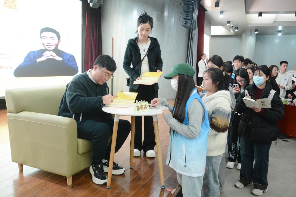 在问答互动环节中,同学们踊跃举手提问,就自己在文学创作和阅读过程中的困惑向蔡崇达老师请教。蔡老师坦诚耐心地回应,与同学们进行思想碰撞。其中一名学生专程带来唐山特产蜂蜜麻糖赠予蔡老师。他谈到正如麻糖需手工反复拉叠方能成就薄如蝉翼的酥皮,蔡老师笔下长辈的爱,也常蕴藏于生活的细碎褶皱间。这成为本场活动的温情注脚,将活动氛围推向高潮。活动最后,蔡老师热情地为现场持有新书的师生签名留念。