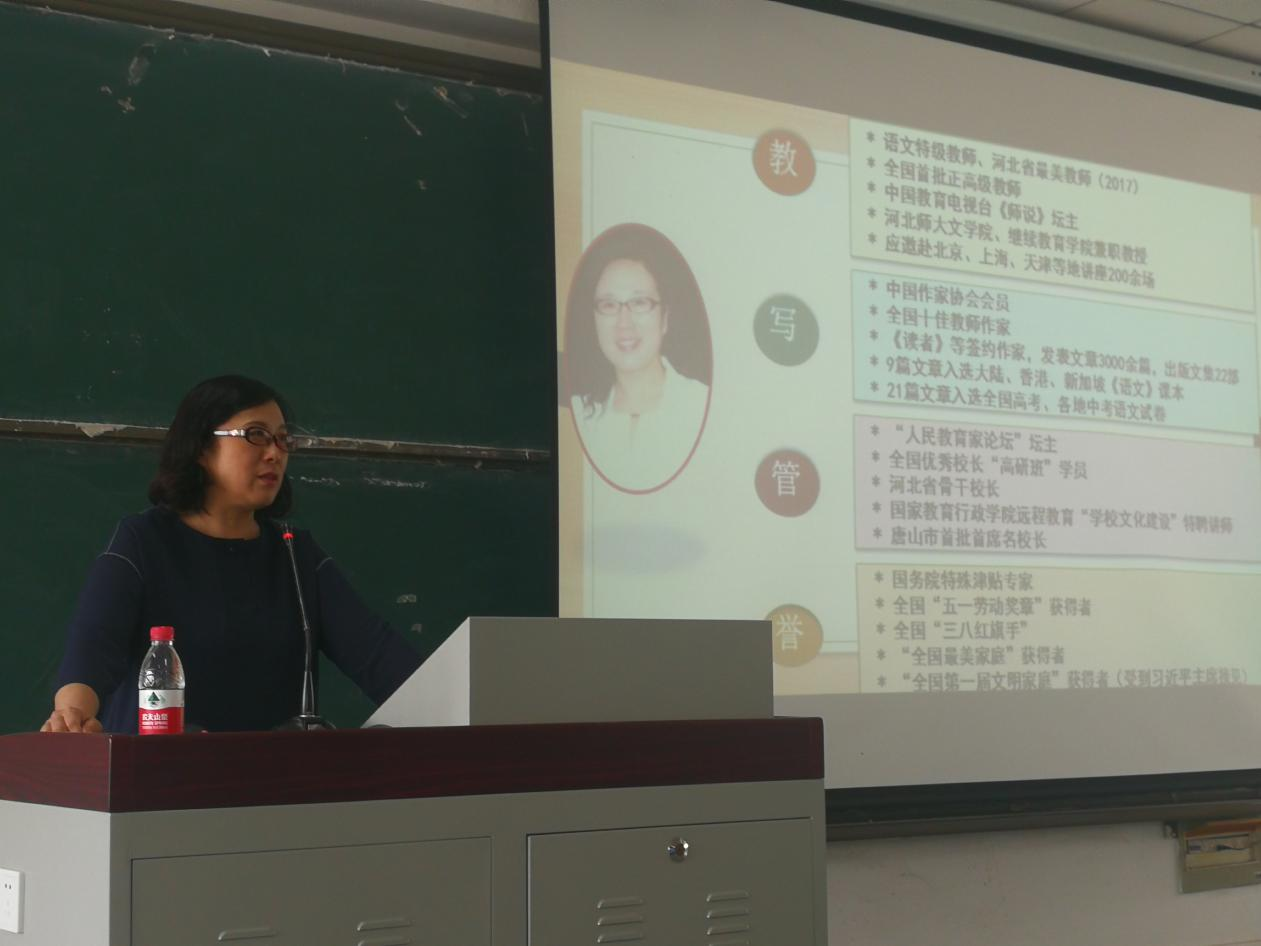 2018年5月22日,中文系邀请国务院政府特殊津贴专家、中国作家协会会员、河北省特级教师、开滦一中张丽钧校长到beat365官网北院文2阶梯教室作了题为《写作——一种邀请对话的姿势》的学术讲座。中文系党总支书记张学鹏、教师素质教研室王相文教授、学科教学(语文)教育硕士与部分本科学生参加了讲座。